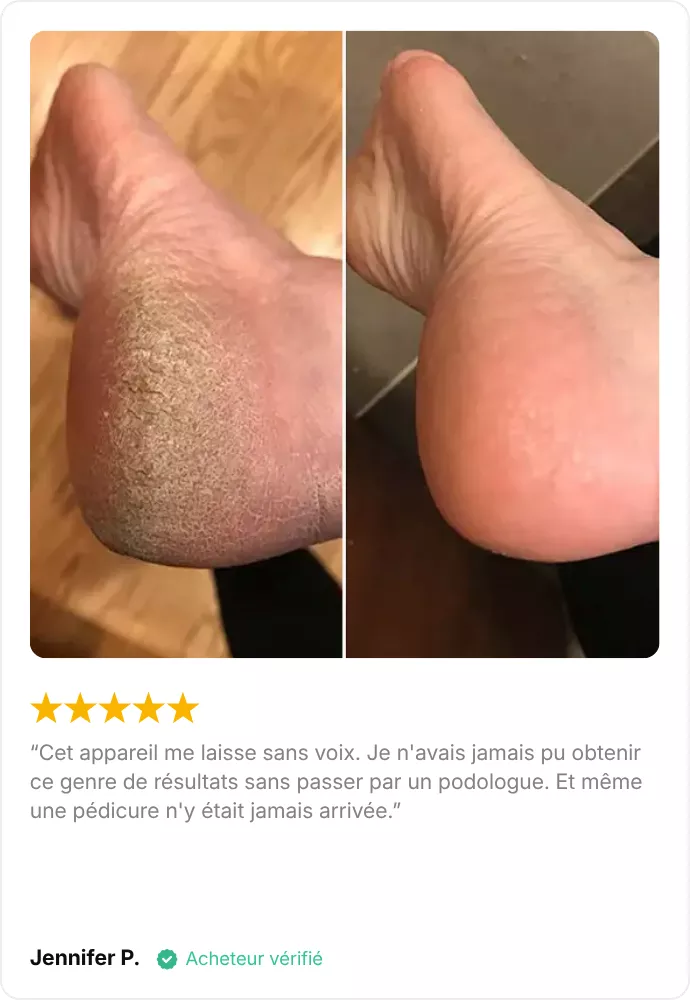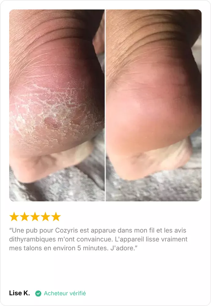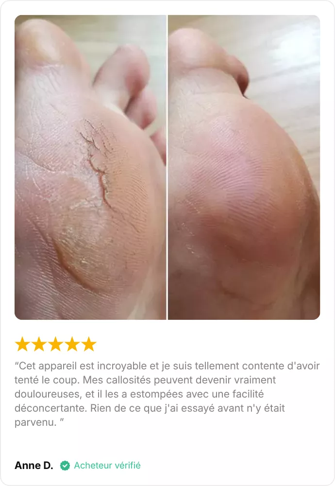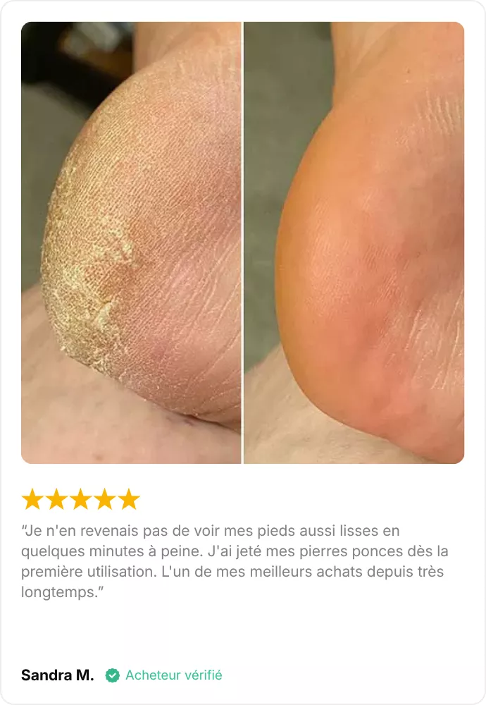 "J'ai toujours été un peu sceptique à l'idée d'acheter quelque chose vu sur Facebook, mais ce produit a dépassé toutes mes attentes. Je n'en revenais pas de voir mes pieds aussi lisses en quelques minutes à peine. J'ai jeté mes pierres ponces dès la première utilisation. Même mon mari, qui n'est pas facile à impressionner, l'a essayé et n'en revenait pas de la douceur de ses pieds. L'un de mes meilleurs achats depuis très longtemps."
