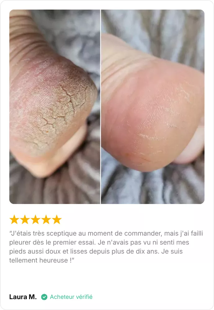 "C'est incroyable !!! J'ai essayé tellement de choses pour mes talons crevassés, sans aucun résultat et avec un temps fou à y passer. Je suis bluffée par les résultats et par la rapidité avec laquelle on obtient des talons magnifiquement lisses."